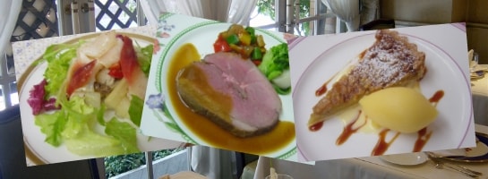 オードブル(常時2種類から) / スープ(常時2種類から) / メインディッシュ = お魚料理1種類、お肉料理2種類 (常時3種類から) …お選びいただけます。
